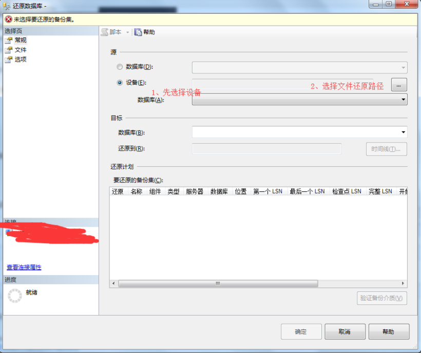 2、在还原数据库弹出框中-》先点击设备-》再点击还原文件路径。