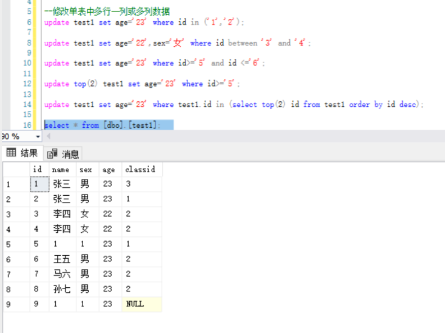 语法:update top(数量) 表名 set 列名1=值,列名2=值2 where 条件;