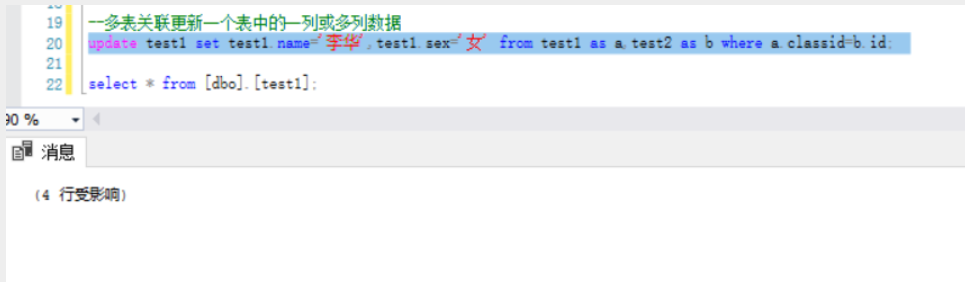 示例:update test1 set test1.name='李华',test1.sex='女' from test1 as a,test2 as b where a.classid=b.id;