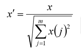 正则化 正则化:和标准化不同,正则化是基于矩阵的行进行数据处理,其目的是将矩阵 的行均转换为“单位向量”,l2规则转换公式如下: