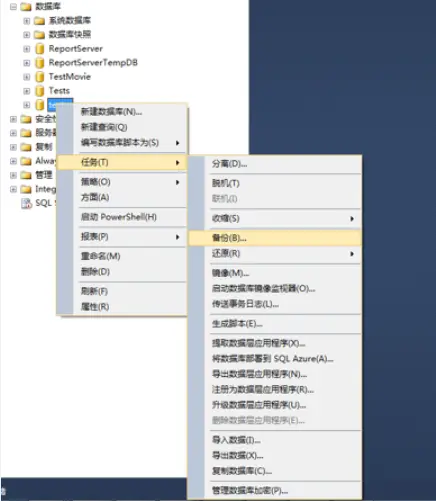 1、连接数据库,选择数据库-》右键点击-》选择任务-》选择备份。