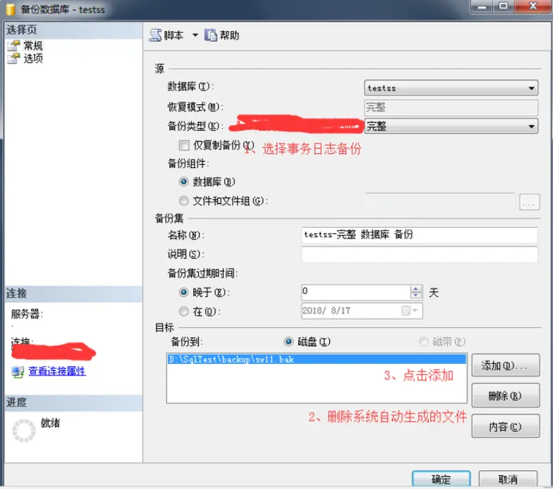 2、在备份数据库弹出框中-》备份类型选择事务日志备份-》删除系统自动生成的文件名-》点击添加。