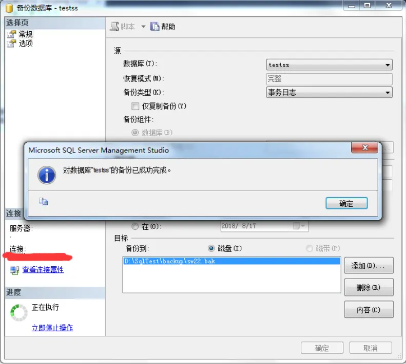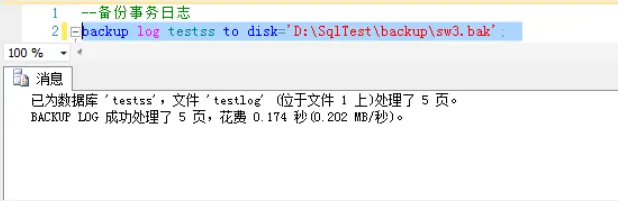 示例:backup log testss to disk='D:\SqlTest\backup\sw3.bak';
