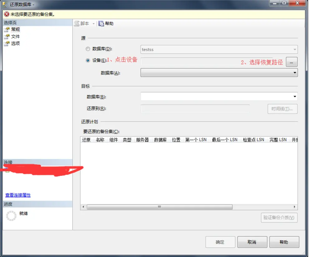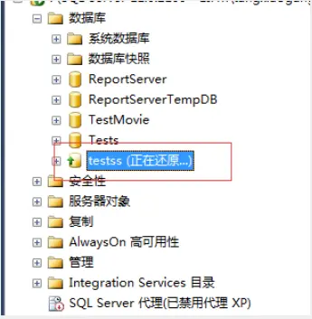 第一步还原数据库:restore database testss from disk='D:\SqlTest\backup\sw1.bak' with norecovery,replace;