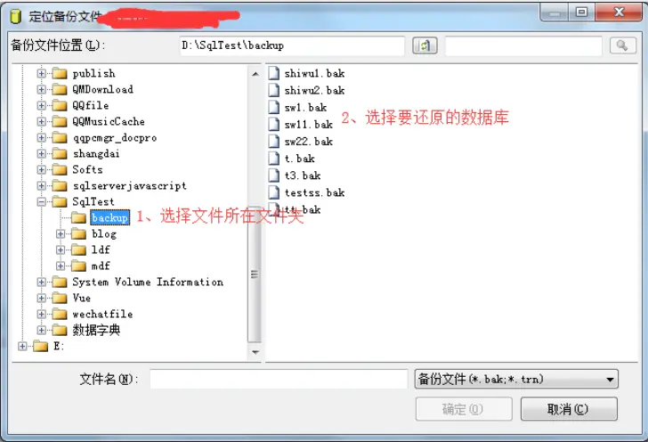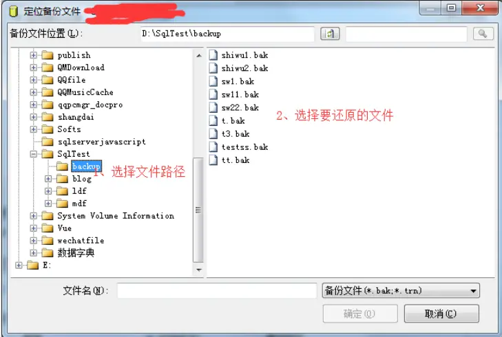 4、在定位备份文件弹出框中-》选择文件所在路径-》选择要还原的文件-》点击确定。