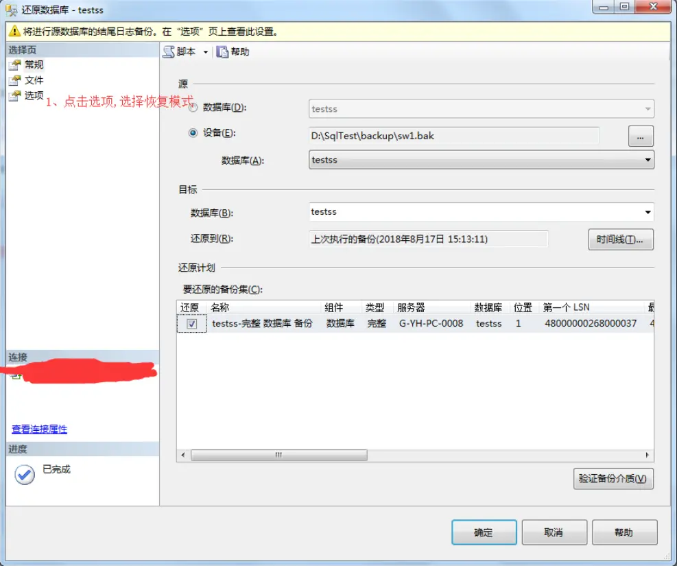 5、在还原事务日志弹出框-》选择选项-》选择要还原的恢复模式。