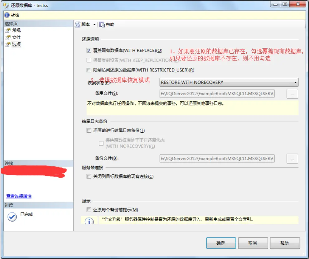 6、在还原数据库弹出框中-》如果要还原的数据库已存在,选择覆盖现有数据库,如果不存在,不必选择-》选择数据库恢复模式为RESTORE WITH NORECOVERY。