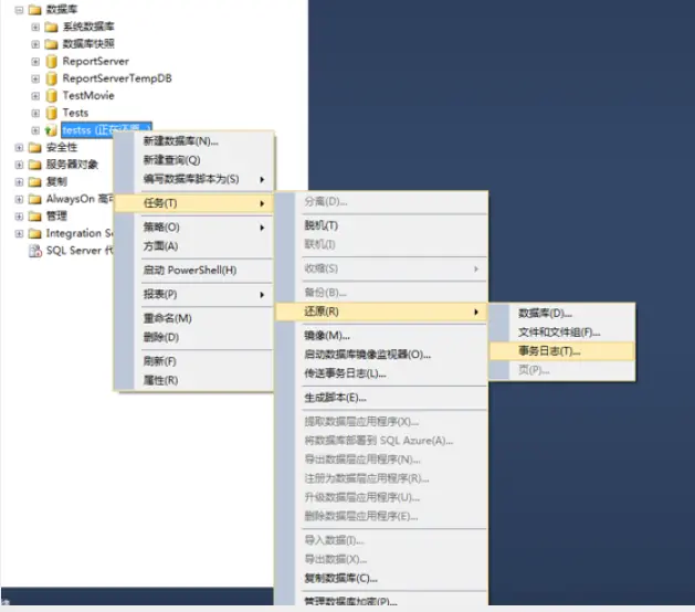1、选择正在还原数据库-》右键点击-》选择任务-》选择还原-》选择事务日志。