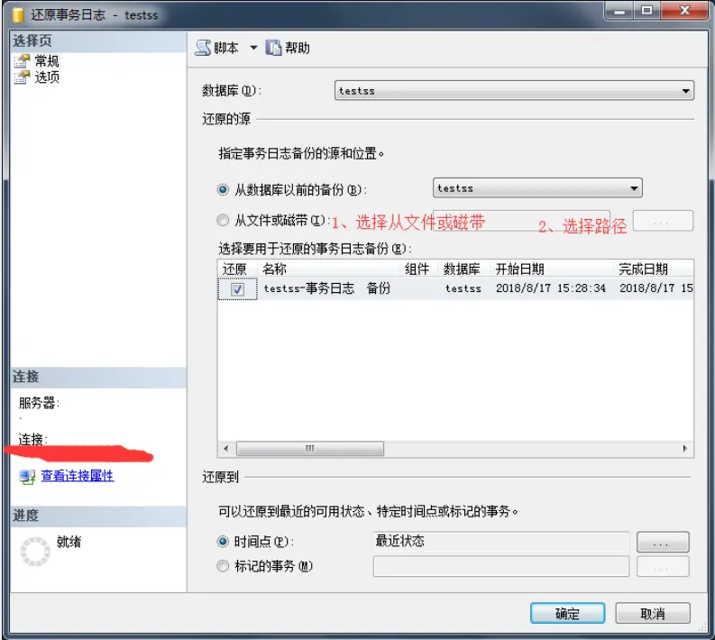 数据库事务日志还原分为两步,第一步为还原数据库,第二步为还原数据库事务日志
