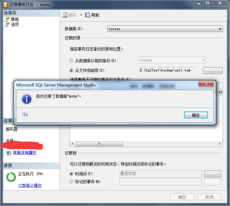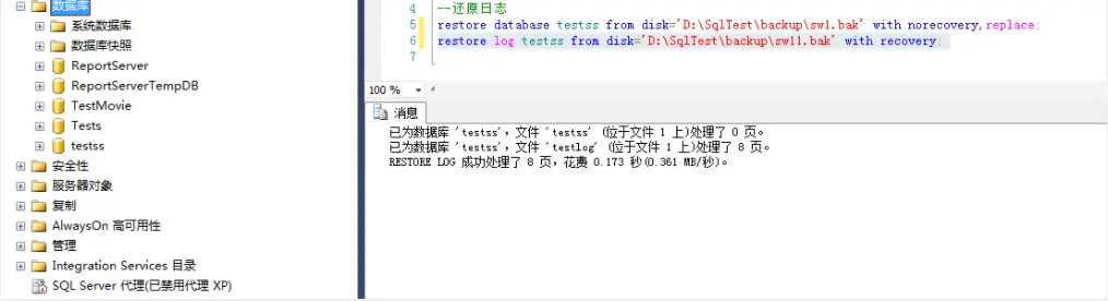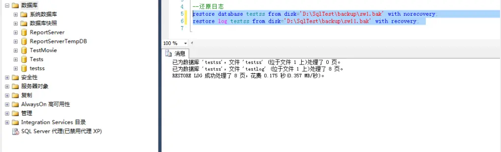 第二步还原日志文件:restore log testss from disk='D:\SqlTest\backup\sw11.bak' with recovery;