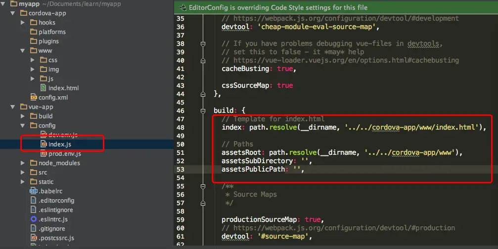 下面是将vue项目编译代码的目录指向cordova的www目录,这样就可以实现项目整合了,vue项目负责页面代码编写,cordova项目负责打包和原生接口调用。
