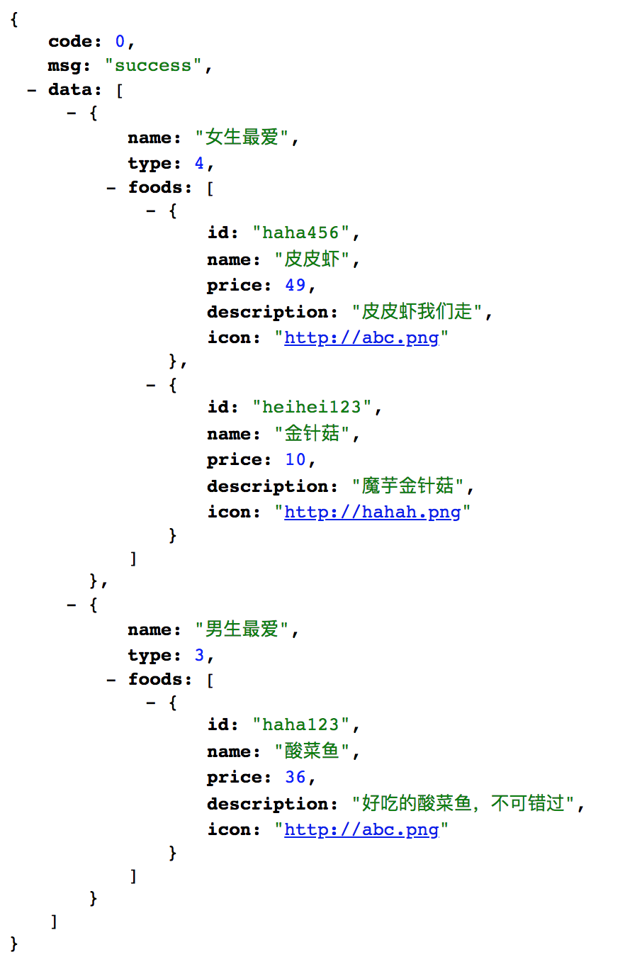 返回结果有三层对象,最外层应该是整个项目统一的数据结构,我们定义为 ResultVO。data 字段里先是商品分类 ProdoctVO,然后每个分类里的 foods 字段才是具体商品 ProductInfoVO。