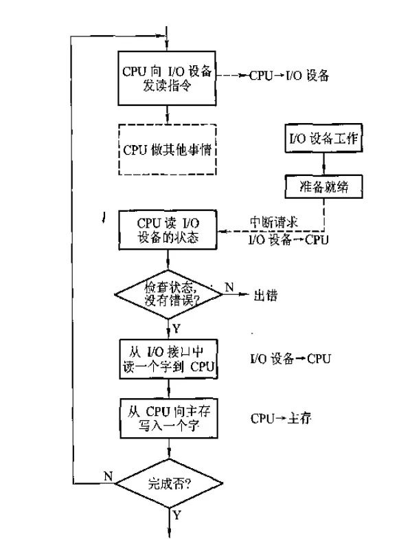 这种方式就要比第一种方式聪明了,上一种方式是由CPU占据主导地位,而这种方式是由I/O设备占据主导。 只有当I/O设备准备好了以后,才会向CPU发送一个中断请求,表示我已经准备好了,然后CPU执行中断,与I/O设备进行数据交互。 图示如下: