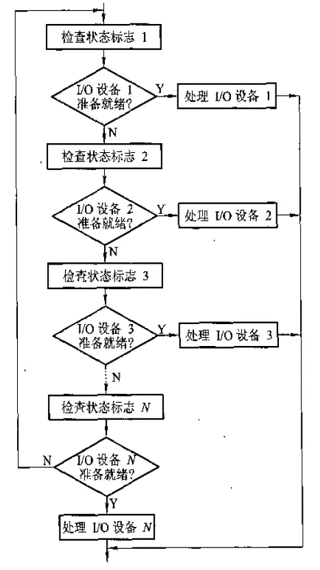 程序查询方式就是利用CPU向I/O设备发送读取指令,然后再检查I/O设备的状态,如果I/O设备已经准备就绪,则一个一个字节的将数据传输到CPU中;如果I/O设备没有准备就绪,则CPU将会不断的向I/O设备发送查询请求,直到I/O设备准备好了。 注意,在CPU不断查询的过程中,原有的程序是被打断了的,如果I/O设备没有准备好,那么原来执行的程序就不会执行,直到I/O设备就绪,且数据读取完毕,程序才会恢复。 上面说的是只有一个设备的情况,CPU会采取踏步查询的方式查询I/O设备是否准备好了。那么如果一个接口连接着多个I/O设备又当如何呢?如下图,当一个设备没有准备好的时候,就向下查询,然后如果还是没有准备好,则循环这个过程。
