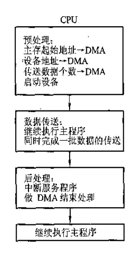如图所示,DMA传输数据的过程包括三个过程。 首先是预处理,找到I/O设备输入的数据要存放在主存中的地址,然后找到I/O设备的地址,接着设定数据传送的个数。 接着是数据传送,因为DMA方式并不占用CPU,所以可以在主程序执行的过程中,完成I/O设备的数据传送。 然后是后处理,即将DMA终结掉。