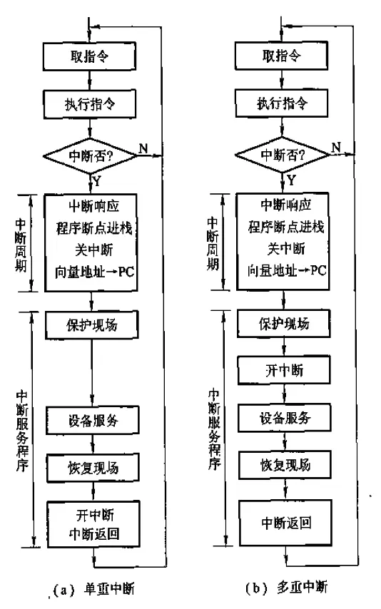 这种方式没有CPU的“原地踏步”式的查询,即CPU不会去等待设备准备好,而是设备准备好了,你直接通知CPU就好了,这无疑大大提高了效率。 注:中断程序的流程如下:保护现场-->中断服务-->恢复现场-->中断返回 这里额外讲述一下中断,实际上有两种中断方式,一种是单重中断,另外一种就是多重中断。