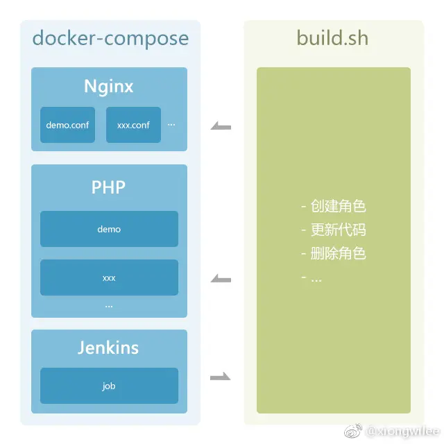 由于在docker中实现了nginx配置文件及php源码文件的映射到宿主机,需要通过管理宿主机上文件就可以管理代码的发布和部署了,build.sh就是用来做这件事情的。
