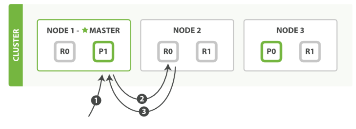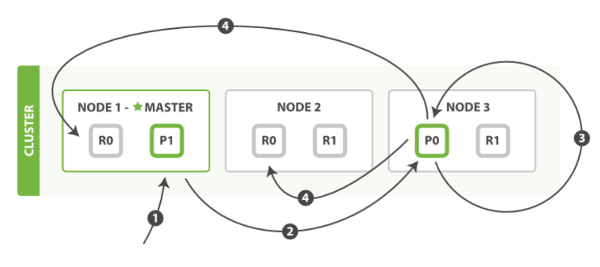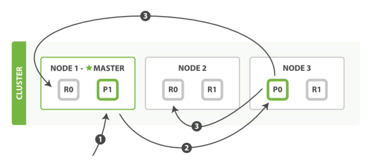 我们能够发送请求给集群中任意一个节点。每个节点都有能力处理任意请求。每个节点都知道任意文档所在的节点,所以也可以将请求转发到需要的节点。下面的例子中,我们将发送所有请求给Node 1,这个节点我们将会称之为请求节点(requesting node)
