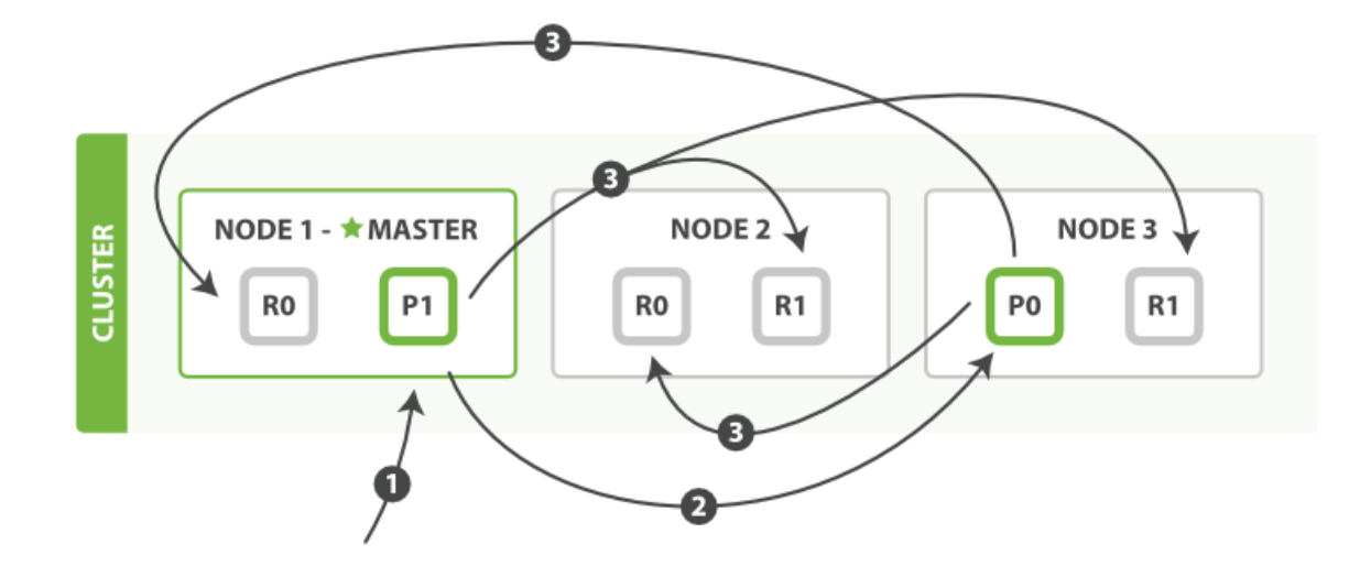 3.Node 3在主分片上执行请求,如果成功,它转发请求到相应的位于Node1和Node2的复制节点上。当所有的复制节点报告成功,Node3报告成功到请求的节点,请求的节点再报告给客户端。