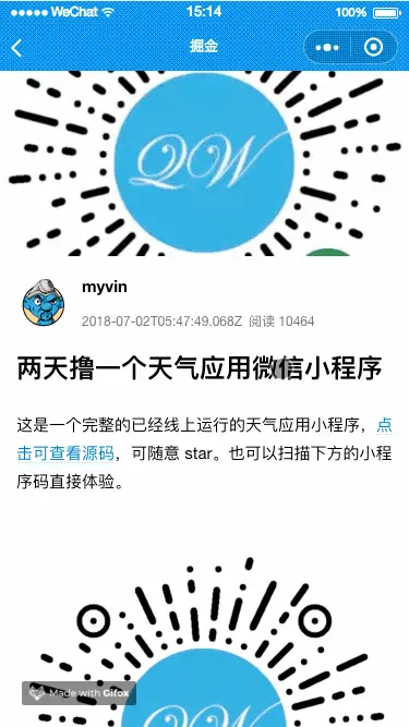 前段时间写了一个简单的小程序 QuietWeather,源码在这里,具体实现相关可查看这篇文章:两天撸一个天气应用微信小程序。但是这个 掘金小程序 和 QuietWeather 完全不是一个数量级的,说完具体实现,天都黑了,这里直接上效果图,感兴趣的可以 查看源码 。实际体验可扫描👆上面的小程序码。