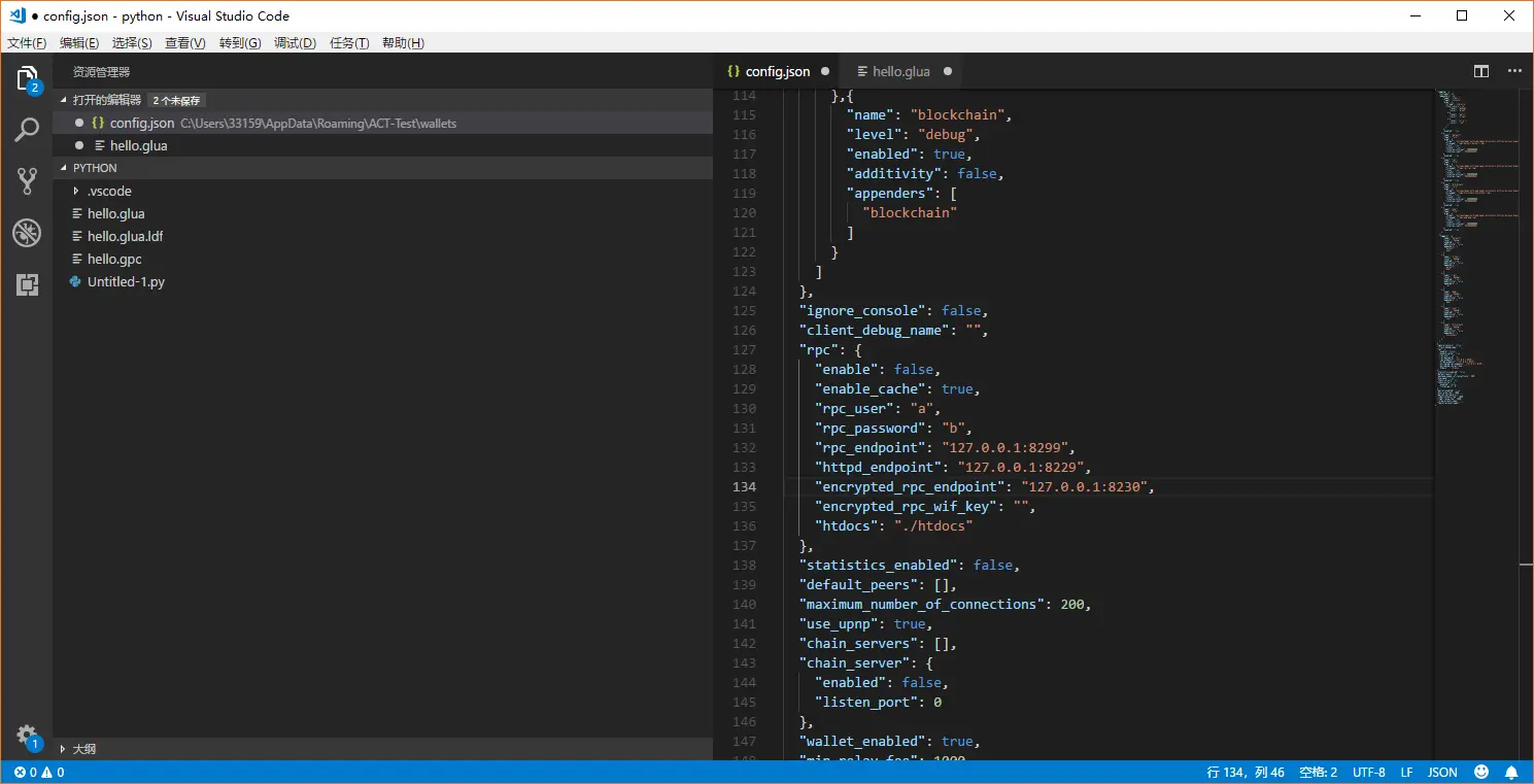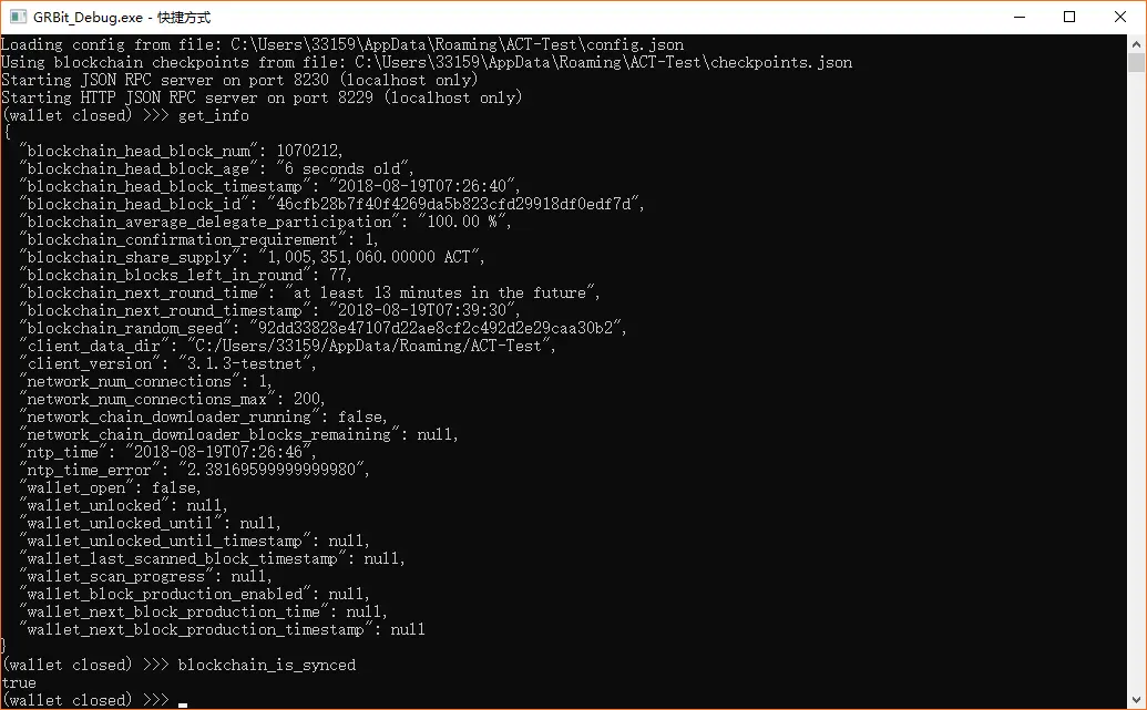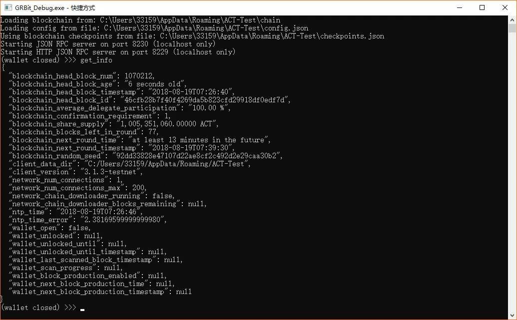 这里的a是用户名 b是密码 8298是socket的端口 127.0.0.1:8299是JSONRPC的地址 C:\Users\33159\AppData\Roaming\ACT-Test\wallets是区块数据的保存地址
