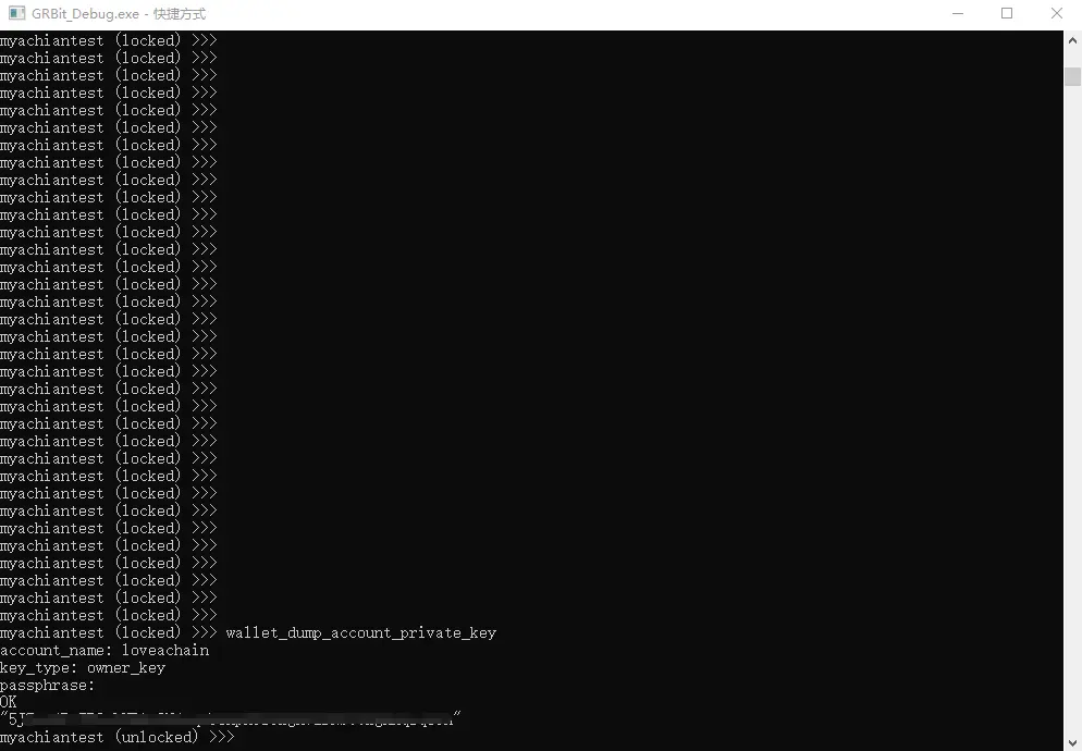 再区块链上只有私钥才是保证账号是你拥有的唯一证明,那么我们该如何获取当前账号的私钥呢,通过wallet_dump_account_private_key命令来获取指定账户的私钥。这里需要传入2个参数, "account","key_type",前面一个是账户名,后面这个是私钥类型,有3个owner_key, active_key, signing_key,这里我们只要使用owner_key就行。