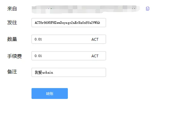向任意地址转账0.01个ACT,我这里使用的是ACT8r86HUFHZwmDeyegc2nErKuGs8Ue2VWhk的地址。
