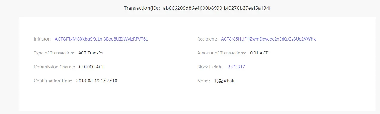 IZCKHPB5%KIPRB_X8WIE7(6.png 转账成功之后我们就可以在Achain的浏览器上看到这一次的转账记录,保存这次交易的ID ,你对喜欢人的表白和爱情誓言就永远记录的区块链上了。