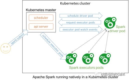 Spark原生支持Kubernetes最大的好处是,不用在Kubernetes集群上再建立一层资源调度系统,只要建立一个新Spark容器镜像,并指派合适的RBAC权限角色,给所要执行的Spark应用程序,就可以在Kubernetes集群上运行Spark程序了。