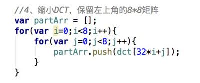 4、缩小DCT,虽然DCT的结果是32x32矩阵,但是我们只保留左上角8x8的部分,这部分呈现了图片中的最低频率;