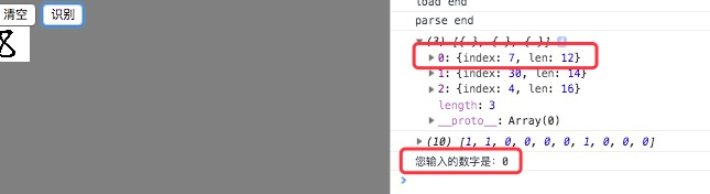 在白色画布中用鼠标写一个数字,然后点击识别,即可在console中看到识别结果;