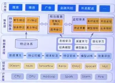 上图是我们平台的系统架构,从底层往上分别是计算层、框架层、数据算法层、服务层、应用层。计算层关注于数据平台多种计算能力集成,以及屏蔽使用细节降低对接成本。框架层封装了多种框架包,实现了按需对接。数据算法层支持完整的pipeline流程,封装了特征处理体系和一些模型优化手段。服务层拥有统一的特征服务,并且封装好了打分逻辑,有完善的监控机制。