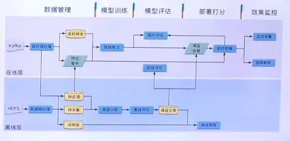 模型评估阶段离线层离线评估完后会直接进入模型仓库,方便复用。线上的模型评估一方面会使用模型仓库中的模型在真正上线生效之前进行预上线,另一边会对线上实时生效的模型进行实时评估。