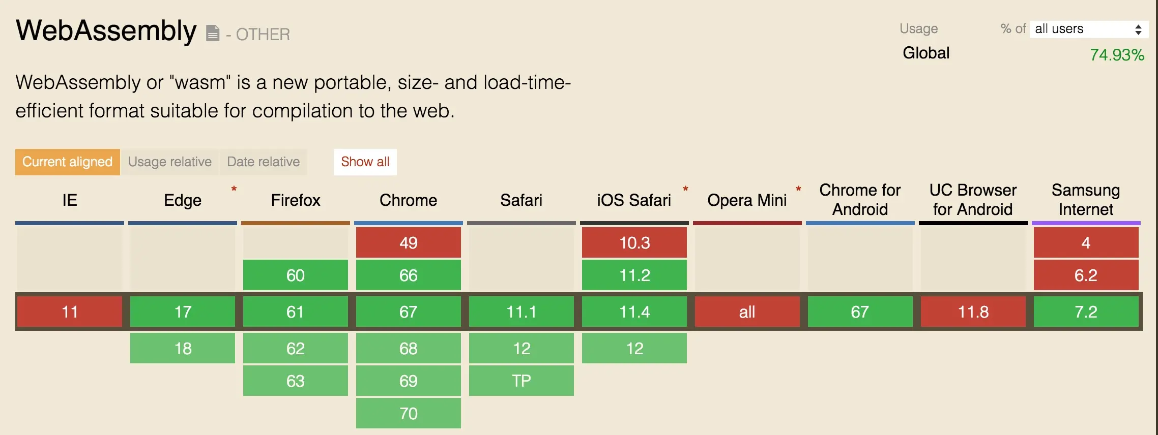 下面这张图,展示了目前(2018年7月)主流浏览器对于wasm的支持情况。