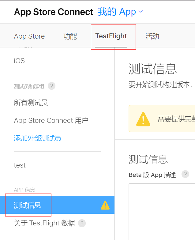 3)在右侧,输入必填的“Beta 版 App 审核”信息。