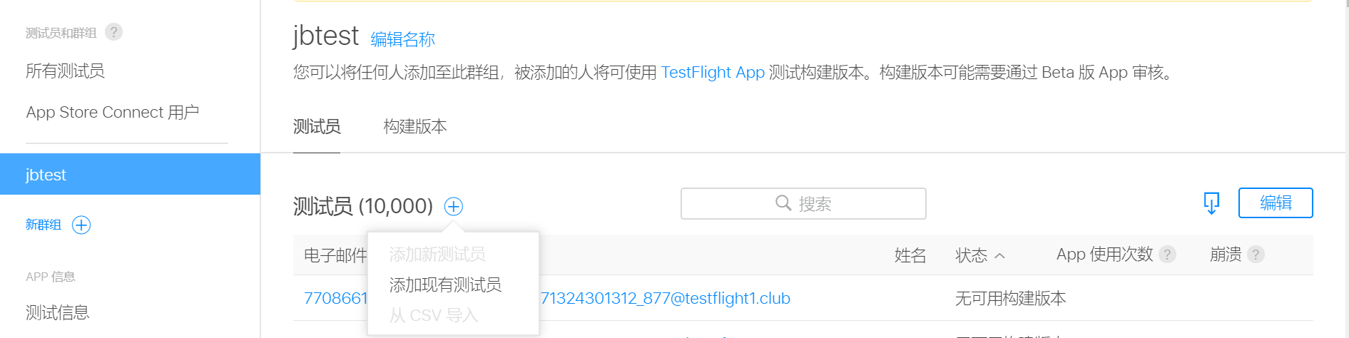3)把 CSV 文件导入到 TestFlight,不要忘记给这个外部测试组添加「构建版本」。导入完成后,开发者会收到申请表可用的邮件,页面就可以使用了。