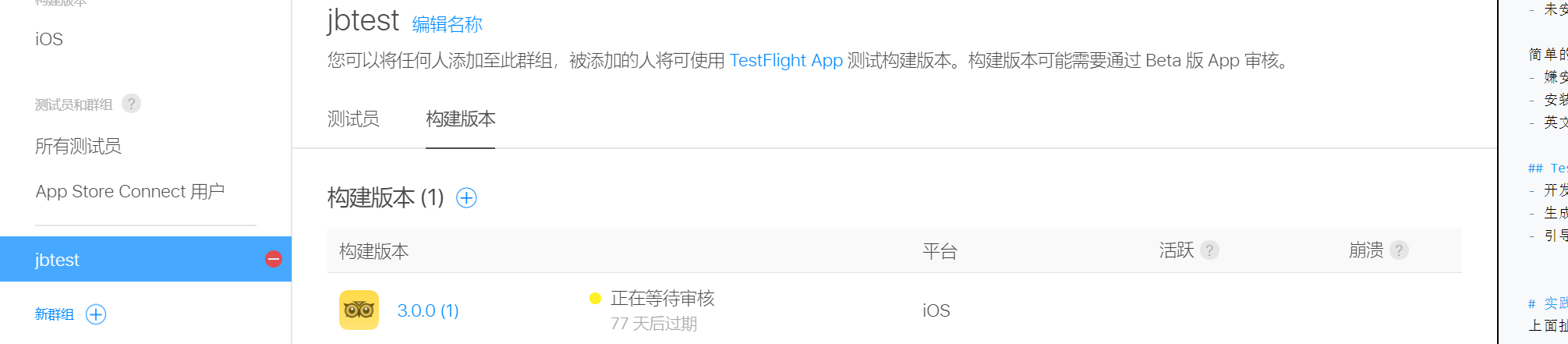 如果邀请了外部人员,则第一个构建版本会提交至"Beta版app审核"。同一版本的后续构建可能不需要全面审核。