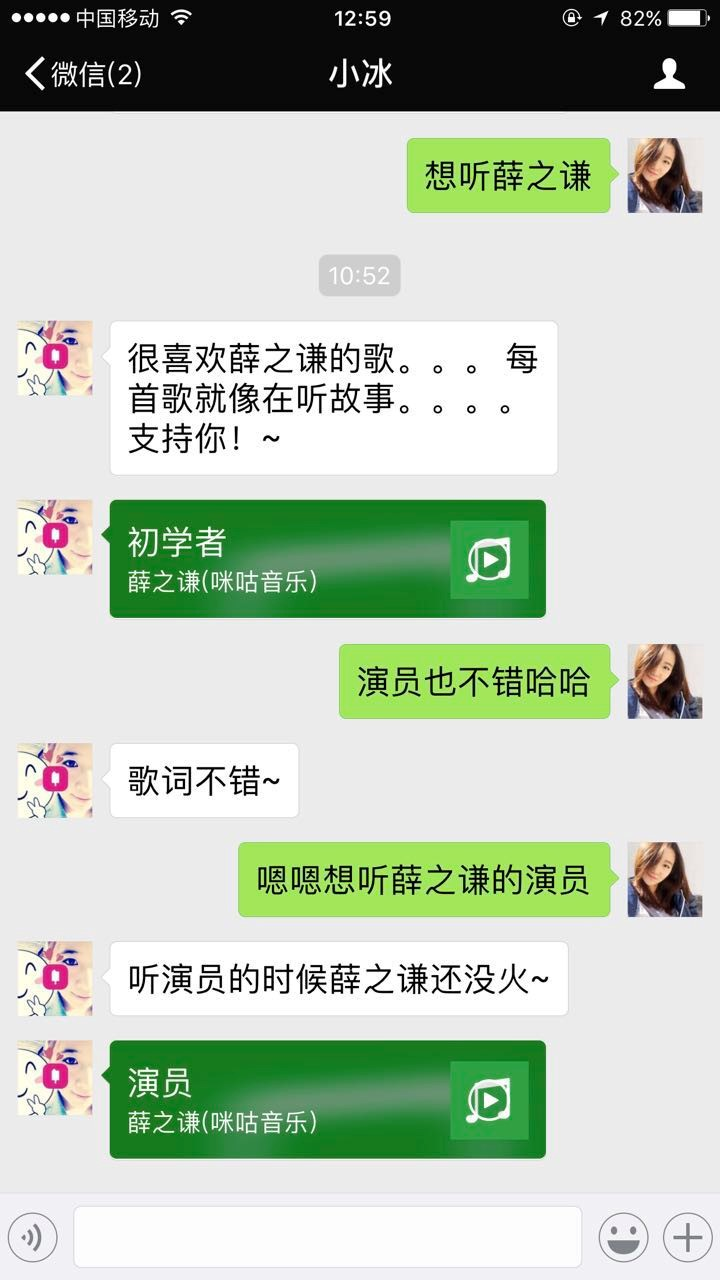 微软小冰作为一款人工智能伴侣虚拟机器人,可以与人进行超越简单问答的自然交互。如果你对微软小冰说“我很喜欢薛之谦的演员这首歌”,小冰就会和你一起探讨她对于这首歌的理解,最重要的是小冰还可以同时把用户提及的歌曲通过“咪咕音乐”播放器直接推送到聊天界面上。用户可以和小冰边听边聊,产生一种音乐理解上的共鸣。小冰的设计追求的已经不仅仅是单纯的AI管理助手和创作者,而是一种可以和人类进行心灵沟通,通过音乐给人带来归属感和存在感的存