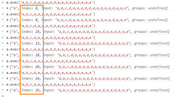 如上图,每次调用a.exec都会返回一个新位置的匹配结果。直到返回null为止。