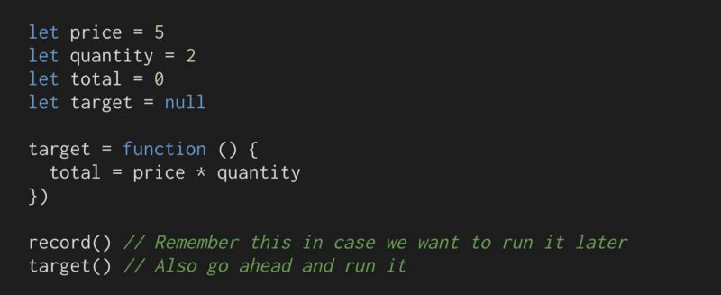 当像这样的一段代码运行并获得价格的价值时,我们希望价格记住这个匿名函数(目标)。这样,如果价格变化,或者设置为新值,它将触发此函数以重新运行,因为它知道此行依赖于它。所以你可以这样想。