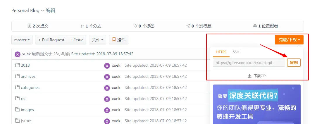 经过以上3步,我们就将码云和本地的Blog建立了连接,那么我们该怎么将Blog部署到码云上呢?别急,接下来就到git登场了。
