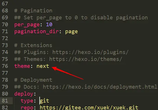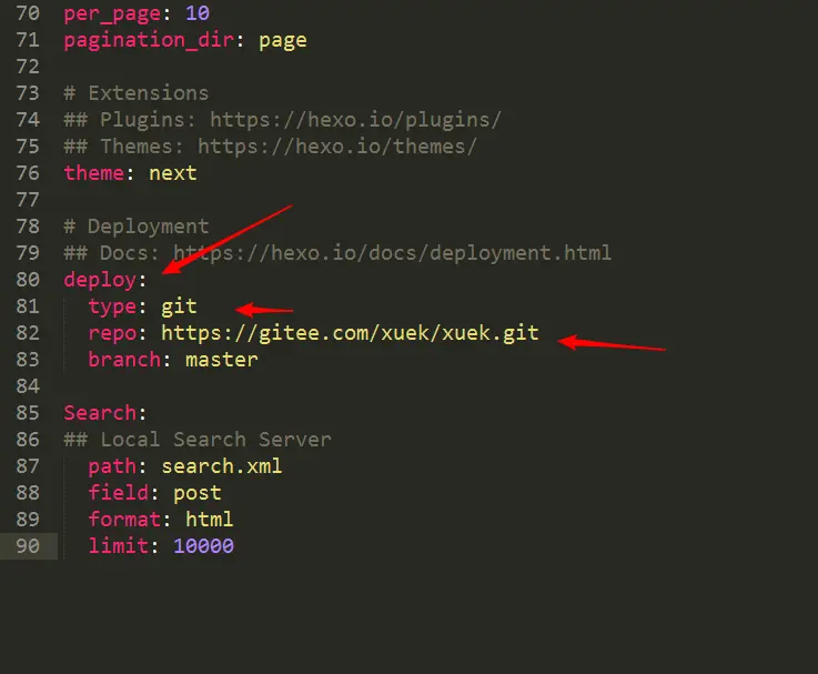 3.找到Blog本地的根目录里的_config.yml文件,找到deploy这一项,将之前复制的HTTPS里的链接复制到repo后面,然后修改type的值为git,然后保存即可。
