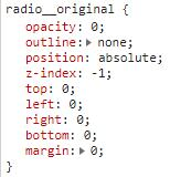 由此可见,整个组件是一个外层label套2个span,我们知道原生的radio标签很丑,样式在各个浏览器不统一,所以必须自己实现所有radio按钮的样式,一般做法是隐藏真正的input,自己用div或者span模拟input标签,这里的label放在最外层的作用是扩大鼠标点击范围,无论是点击在文字还是input上都能够触发响应,当然如下通过for属性绑定input的id属性也可以实现