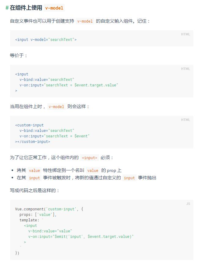 上面定义了getter和setter,getter首先判断自己是否是在单选框组组件内,如果是旧返回单选框组的value,否则就是自己的value,而label则是用户传入的一个属性,代表单选组件自己代表的值,这里的一个难点是this.value到底是啥,查看源码得知this.value是一个prop,但是官网上单选组件根本没有这个value供用户定义,这其实是在组件上使用v-model的做法,官网介绍如下