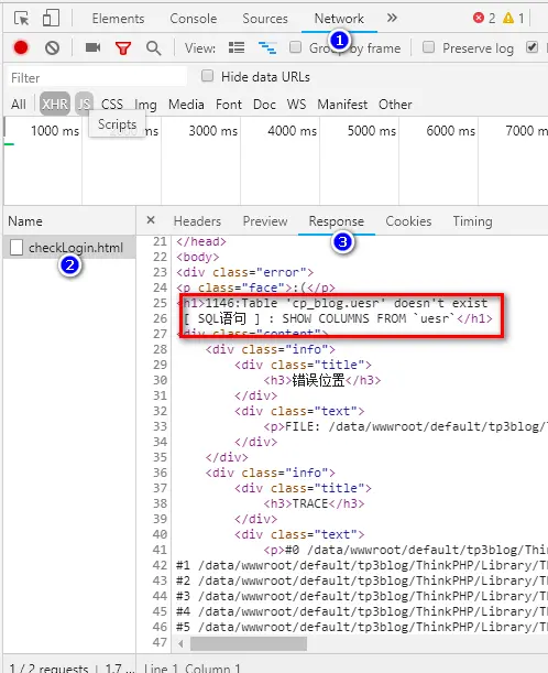 ajax登录验证异常原因分析 普子 2018-08-20 393 阅读1分钟 遇到的问题:打开谷歌调试工具:打开 checkLogin.html这个链接后出现:刷新页面,重新让错误再次暴露一次,在谷歌调试工具里 Network->XHR->Response中找到报错信息。原来是数据表没链接成功,user表被我些成了 uesr,而视图页面又不会去报服务器端反馈的数据库错误信息,导致排错困难。