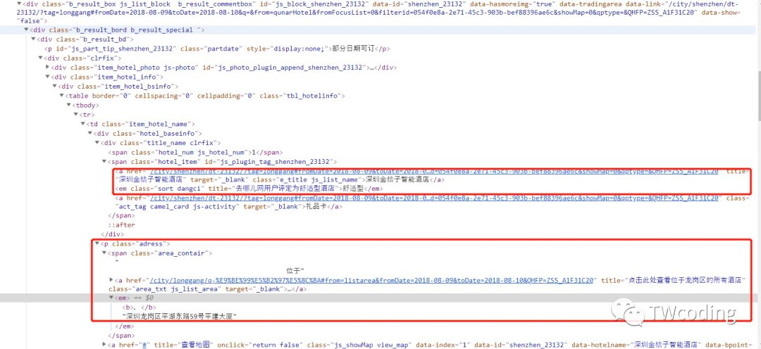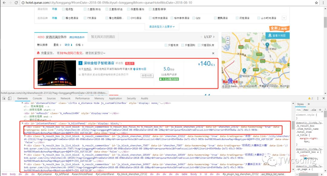 经过分析可知每个酒店的内容是在id为"jxContentPanel"中,并且在其下class为"b_result_box js_list_block"中可以看到每个酒店的详细信息。如下图所示。