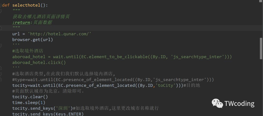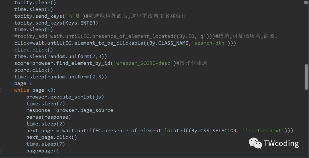 我们已经有目的地城市列表了,所以在在访问去哪儿网址时,只用输入所获得的城市就可以进行搜索了。然后就可以获取酒店页面了。 并且要获得多个页面的酒店。所以也要实现翻页的方法。实现如下: