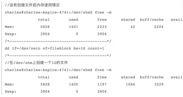 由上面分析,我们知道基于 tmpfs 的文件也是使用 cache 的,我们可以在/dev/shm上创建一个文件来检测下: