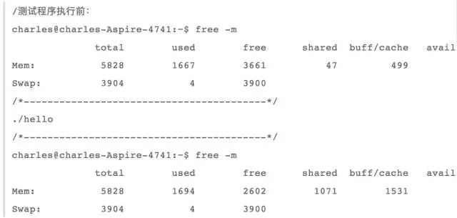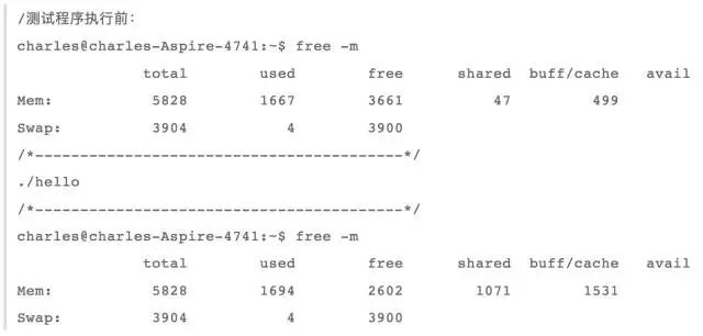 从上述结果,我们可以看出,只有buff/cache增长了1G,即当进行共享匿名映射时,这时是从 cache 中申请内存,道理也很明显,因为父子进程共享这块内存,共享匿名映射存在于 cache,然后每个进程再映射到彼此的虚存空间,这样即可操作的是同一块内存。