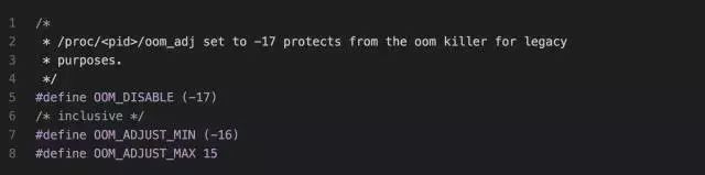 这是内核关于这个oom_adj调整值的定义,最大可以调整为15,最小为-16,如果为-17,则该进程就像买了vip会员一样,不会被系统驱逐杀死了,因此,如果在一台机器上有跑很多服务器,且你不希望自己的服务被杀死的话,就可以设置自己服务的 oom_adj 为-17。